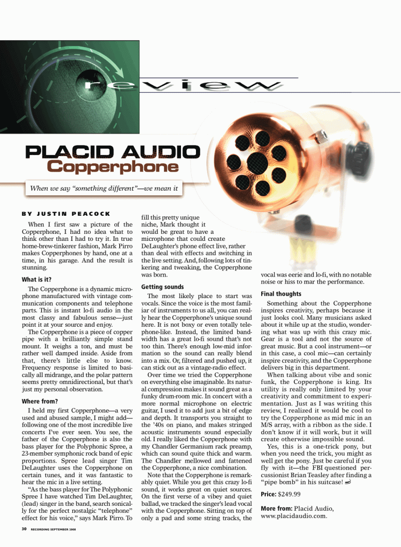 Dan ended up using a few Copperphones to achieve an ‘old-timey’ orchestra sound for the intro black and white sequence of the animated Pixar movie, “Up”.